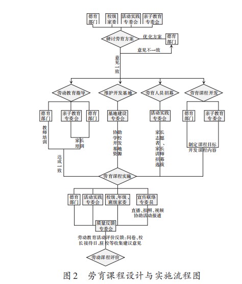 在家委会联动机制的保障下,家校互补共商,合力并 发 ,共 同 规 划 劳 育 课 程 设 计 与 实 施 的 基 本 流 程 (见图2)。