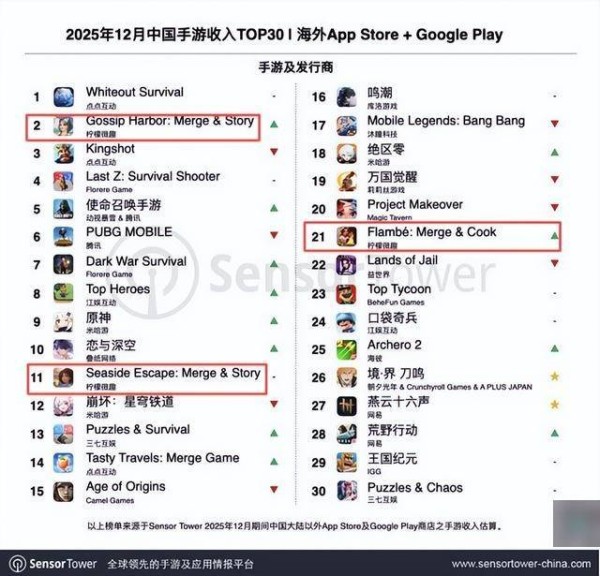 根据Sensor Tower的12月中国手游收入榜单(海外App Store+Google Play),第二名正是柠檬微趣《Gossip Harbor》,第11名也是柠檬微趣《Seaside Escape》,第14名则是点点的《Tasty Travels》——出海市场TOP15的重要位置上,已经出现三款休闲手游。
