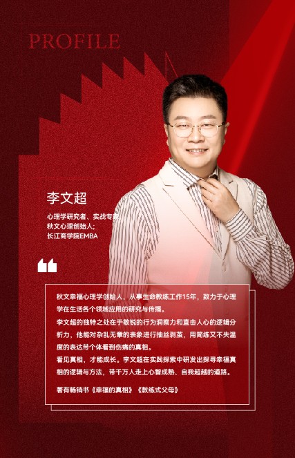李文超先生和徐秋秋女士,在新书中回答了当代父母如今面临着怎样的教养新挑战以及在养育过程中存在怎样的思维局限。同时他们也提出了自己的破局思路,帮助广大中国家长升维养育理念和方式。他们以幸福心理学为核心支持体系,整合多年心理学课程以及个案咨访中的案例经验,为所有父母分享了全新的家庭教育方向及详尽的实操练习,帮助更多父母成为孩子真正的人生教练。