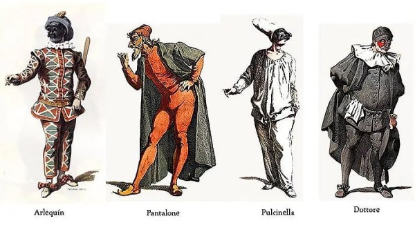 1. 扎尼(Zanni):仆人、小丑;如Harlequin、Brighella、Scapino、Pulcinella等角色。