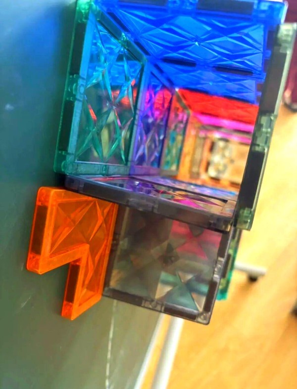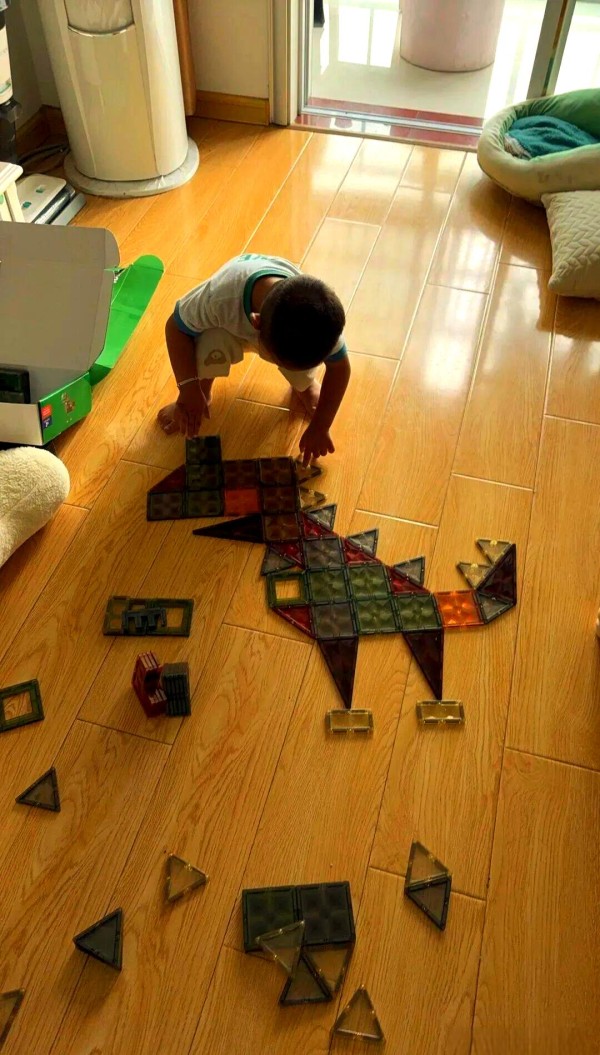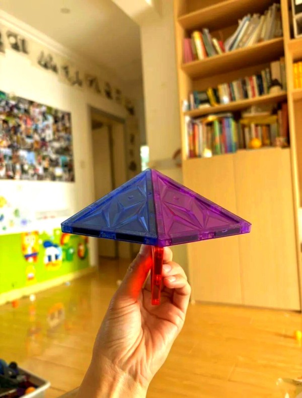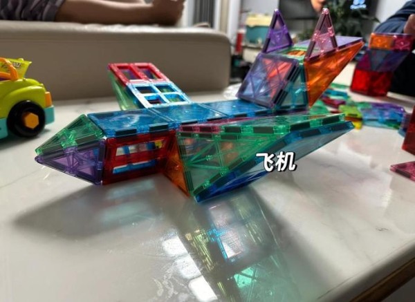 小飞机的制作激发了孩子的创造力,他们通过组合磁力片展开无限想象,从简单造型到复杂结构,提升了动手能力和思维能力。接着,那段时间里,他总是独自一人在家中挥舞着磁力片,想象着飞机在空中翱翔的场景。他一会儿说要飞往外婆家,一会儿又幻想飞往遥远的火星。后来,我惊喜地发现,这些磁力片甚至可以被巧妙地组合成立体结构,就像这样: