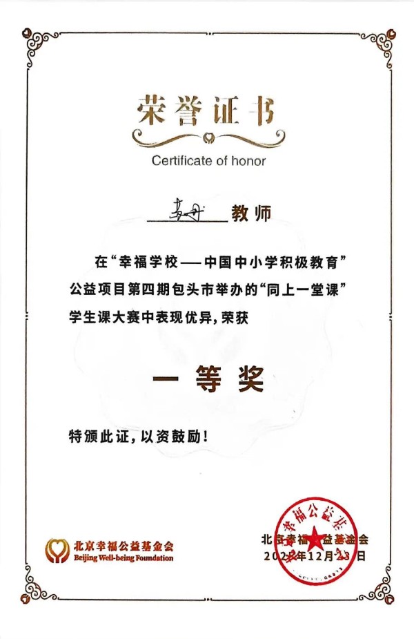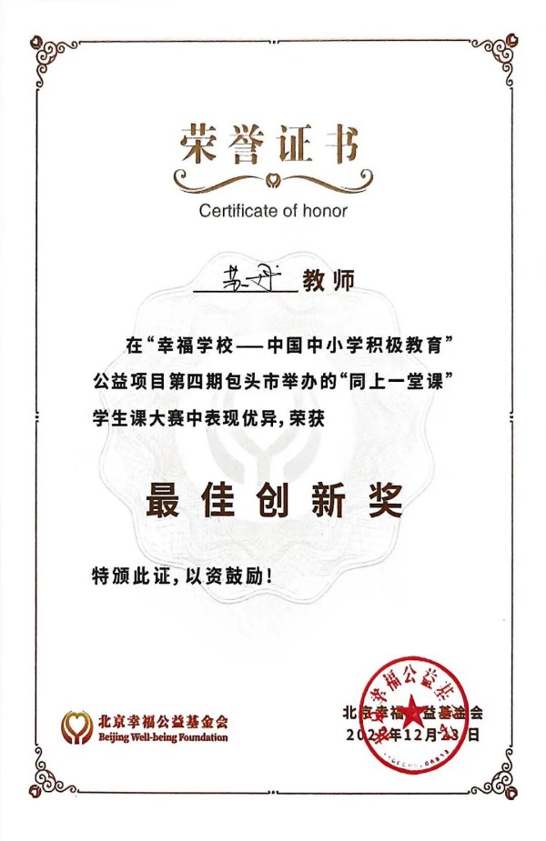 为推动积极教育理念落地课堂、滋养儿童心理健康成长,12月25日至26日,由北京幸福公益基金会主办的“积极教育幸福学校项目心理健康学生课竞赛”在内蒙古科技大学实验小学举行。本次竞赛创新采用“研发专家+在职教师同上一堂课”模式,汇聚包头市九所幸福学校的教育力量,围绕积极心理主题展开教学交流。昆区第二实验小学心理教师苏丹凭借扎实的教学功底与鲜明的课堂创新,在比赛中脱颖而出,荣获一等奖与最佳创新奖。