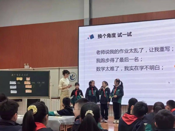 在《换个角度试一试》一课中,苏丹老师以活动为载体,引导学生体验“换个角度”看待问题的积极力量。课堂通过趣味互动和情景演绎,让学生直观理解“想法是情绪的遥控器”;借助“虽然……但是……”句式练习与小组合作,帮助学生掌握情绪调节的技巧,并将所学融入实际生活。
