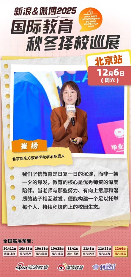 在此背景下,12月6日,由新浪教育、微博教育、择校行联合主办的新浪&微博2025国际教育秋冬择校巡展·北京站第二场顺利举行。活动汇聚京城80余所优质国际化学校招生官,搭建家长与校方面对面深度沟通的桥梁;同时邀请20余位资深校长、教育专家及优秀学生代表,从择校策略、课程规划、家庭赋能、教育趋势及学习实践等多元维度分享解惑,助力北京家庭精准把握国际教育动态,明晰升学路径。