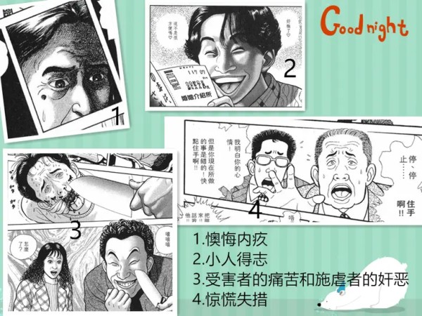 总之,作者想展现的是光怪陆离的人类社会,而不仅仅只是一种风格的故事。另外90%的故事结局,都会有很多人开心,紧扣住漫画主题《快乐人生》,虽然并不一定是主角是好人快乐罢了。比如杀了人却不被起诉的杀人犯,又或者我说的血腥报仇的老好人老师,他们的人生也非常快乐。