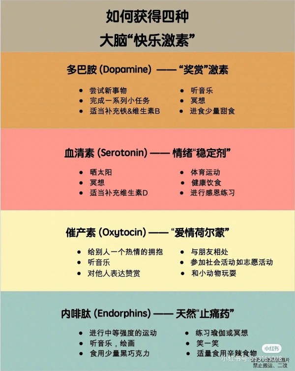 附: 与积极情绪相关的激素:多巴胺、内啡肽、血清素、催产素