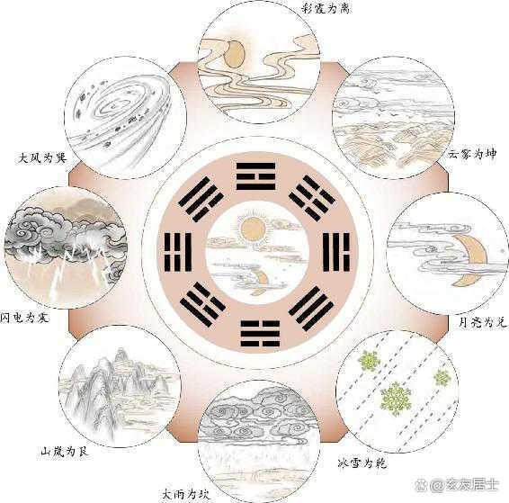 乾卦性质刚硬,所以雹、霰等事物就属于乾卦。坤卦表示阴极,昏昏沉沉的天气和朦胧不清的云雾等都属于坤卦。坎卦原来的意义是水,在天时气象方面就表示雨雪、露水。又表示月亮。离卦原来的意义是火,在天时气象方面就表示闪电、霓虹、霞光,又表示太阳。艮为山,表示山中的云雾。兑卦属金,在天时气象方面表示新月、星辰。震卦仍然代表雷,巽卦仍然表示风。