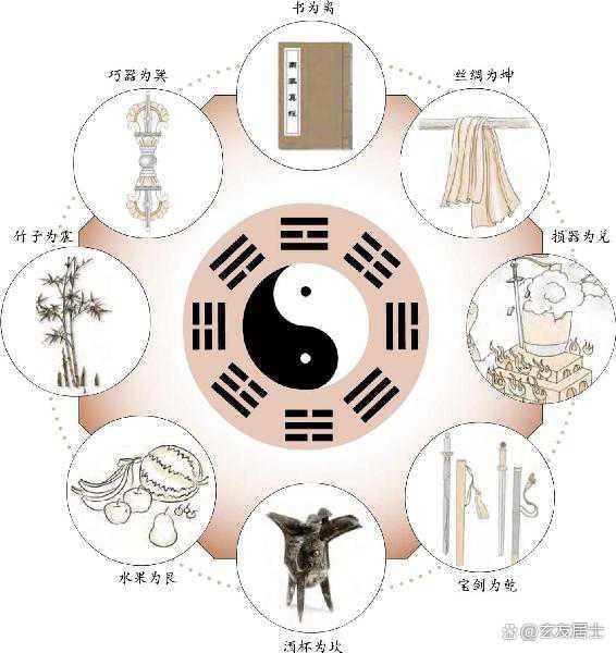 乾卦表示金玉、宝珠、帽子、镜子、圆形之物、刚性之物。坤卦表示布帛、丝绵、五谷、瓦器、方形之物、柔性之物。震卦表示木竹、芦苇、花草、竹木类乐器。巽卦表示木香、绳子、植物、长物、竹木、工巧之器。坎卦表示酒器、水具、带核之物、柔软之物。离卦表示火、书、甲胄、干戈、槁衣、干燥之物、赤色之物。艮卦表示土石、瓜果、黄物、土中之物。兑卦表示金刃、金属类乐器、废弃之物、破损之物。