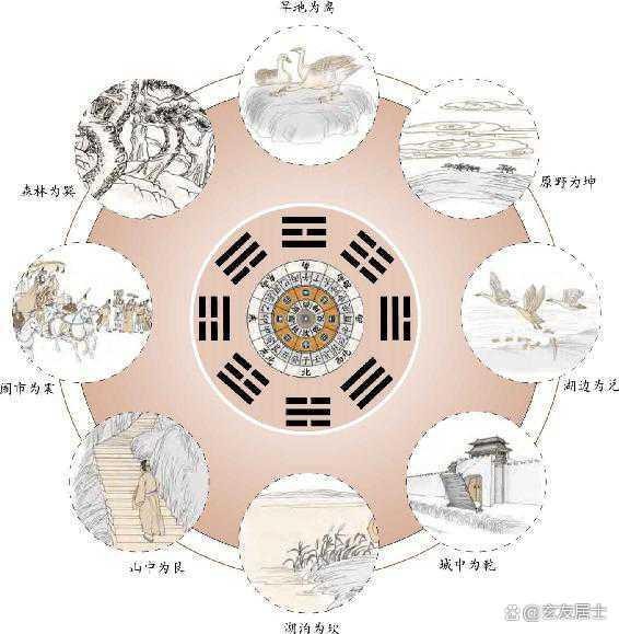 乾卦表示京都、大的城市、形胜之地,高亢之所。坤为地、表示野外、乡里、平地。震具有生发性、五行属木、所以表示森林、竹林、草木茂盛之所,又表示闹市。巽也是属木,所以表示草原,草木繁茂之所、花园、果园、菜园。坎五行属水、所以表示大江大河、湖泊沼泽、泉水溪涧、沟渎池沼等与水有关的场所。离为火,表示干燥之地、窑灶、冶炼场所。艮为山,所以表示山脉高原、丘陵、山路等与山有关的地方。兑卦表示河边,山崩地裂之地。