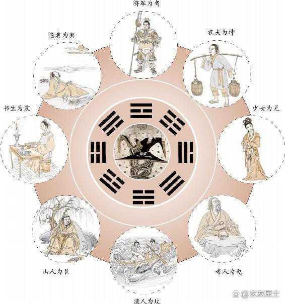乾卦表示刚健有力,为君父、官员、大人、老人、长者、宦官、名人。坤卦表示宽厚包容,为老母、农夫、平民百姓。震卦表示多动易怒,为好动易怒的将军。巽卦表示进退不决,为秀才、寡妇、山林中的隐者、仙道之人。坎卦表示阴险卑下,为渔夫、船夫、盗贼。离卦表示聪明好学,为文人、士兵。艮卦表示沉着稳重,为闲人、山中之人。兑卦表示柔弱活泼,为歌妓、演员、翻译家、巫师。