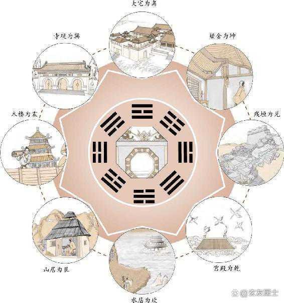 乾卦表示高大的楼台、厅堂、大厦、驿舍,西北向之居。坤卦表示村居、矮屋、土屋、仓库,西南向之居。震卦表示山林中的房子、木质楼阁,东向之居。巽卦表示佛寺、道观、园林、山林之居,东南向之居。坎卦表示近水楼台、望江楼、茶馆、酒肆、湿地之居,北向之居、离卦表示阳明之宅、虚室、明窗之居,南向之居。艮卦表示山居、近石之宅、近路之宅,东北向之居。兑卦表示近泽之居、断壁残垣,西向之居。