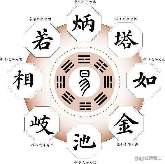 乾卦五行属金 ,所以带金字旁的字都属于乾卦。坤卦表示大地,所以带提土旁的字都属于坤卦。震五行属木,带木字旁的字都属于震卦,带雨字头的也属震卦。巽五行属木,但木气弱于震,所以带草字头的字都属于巽卦。坎为水,在五行中也属于水、所以带三点水的字都属于坎卦。离为火,在五行中也属于火,所以带“火”的字都属于离卦。艮为山,带山字旁或石字旁的字属于艮卦。兑中含“口”字,带“口”的字都属于兑卦。