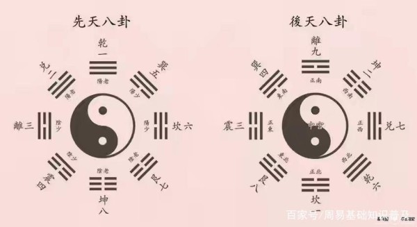 先天八卦与后天八卦: 先天八卦是上古时期伏羲据河图洛书所做,称为先天八卦图,后天八卦是周文王姬昌据先天八卦推演而成的,二者在八卦的名称,图示,以及阴阳五行的对应关系上一致的,区别在于二者的卦序及方位上不同而已。