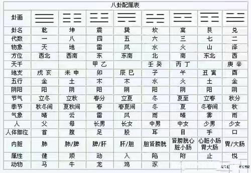 8.内脏取象: 乾为肺,坤为肺脾,震为脾肝,巽为肝胆,坎为胆肾膀胱,离为肾膀胱心脏小肠,艮为心脏小肠胃大肠,兑为胃大肠。