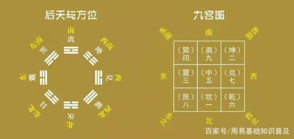后天八卦卦序为坎一,坤二,震三,巽四,五中宫,乾六,兑七,艮八,离九。对应方位为坎对应北,坤对应西南大学震对应东,巽对应东,巽对应东南,中宫对应中,乾对应西北,兑对应西,艮对应东北,离对应南。