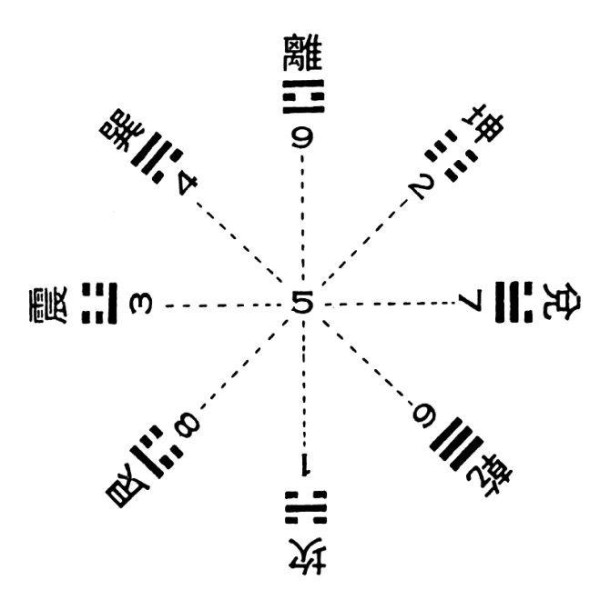 具体来说,坎卦(☵)对应洛书数 “一”,方位为北方。坤卦(☷)对应洛书数 “二”,方位为西南方。震卦(☳)对应洛书数 “三”,方位为东方。巽卦(☴)对应洛书数 “四”,方位为东南方。中宫无具体卦象对应,洛书数为 “五”。乾卦(☰)对应洛书数 “六”,方位为西北方。兑卦(☱)对应洛书数 “七”,方位为西方。艮卦(☶)对应洛书数 “八”,方位为东北方。离卦(☲)对应洛书数 “九”,方位为南方。