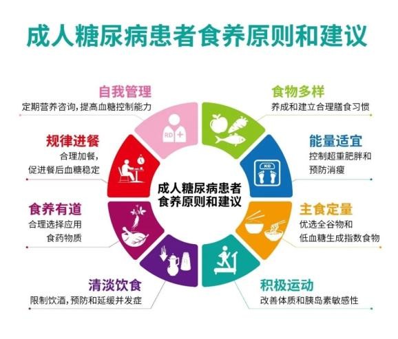 膳食管理和治疗是糖尿病患者血糖控制的核心。应遵循平衡膳食的原则,调整适合自己的食物多样、主食定量、蔬果奶豆丰富、肉类恰当,少油、少盐、少糖。在控制血糖的同时,培养和建立合理的膳食模式,保证每日能量适宜和营养素摄入充足。