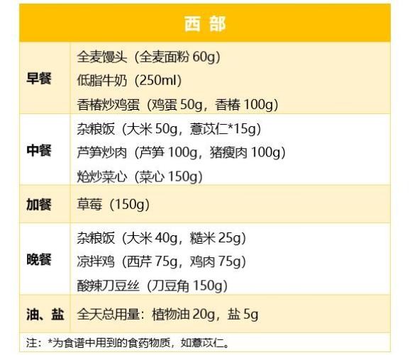 以下食谱适合轻体力活动的成人糖尿病患者,一天食谱的能量在1600~2000kcal范围,使用者可结合自身活动量及其他因素合理调整能量。食谱设计保持食物多样,尽量选择低GI食物、食药物质和中医食养方。全天限量烹调油25g,盐5g。