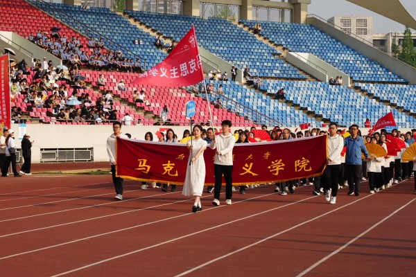 8点30分开幕式在全校师生的欢声中正式开始。彩旗飘扬,风华正茂,西南交通大学国旗护卫队以昂扬的姿态,高扬五星红旗,率先入场。随后,各学院方阵活力四射,展现出积极饱满的精神风貌。其中,马克思主义学院方阵步伐整齐,精神抖擞,高喊“精神引领,强国复兴,使命担当,勇毅前行”的口号,用手中的扇子和党徽展现爱党之心,朝气蓬勃,斗志昂扬,顺利地完成了方阵表演。