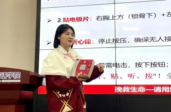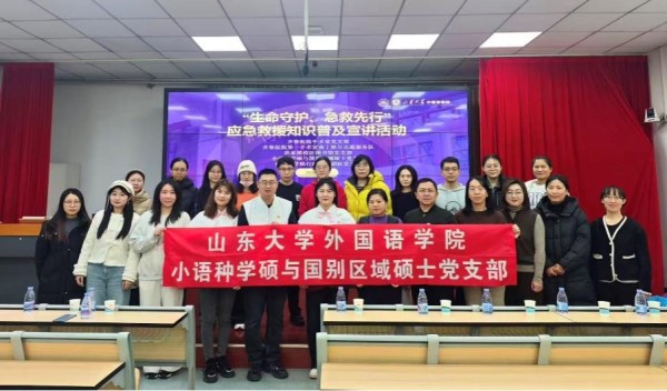 岁暮天寒,安全相伴。为增强师生安全意识与应急救护能力,1月7日下午,“生命守护,急救先行”应急救援知识普及宣讲活动在外国语学院7号楼301教室顺利举行。本次活动由外国语学院小语种学硕与国别区域硕士党支部、洪家楼校区图书馆党支部携手组织,联合齐鲁医院第一手术室南丁格尔志愿服务队、外国语学院行政服务团队党支部共同举办,活动旨在以专业急救知识普及为抓手,将生命教育融入基层党建实践。齐鲁医院第一手术室护士长房馨、主管护师赵博文、护士李悦担任主讲嘉宾;外国语学院行政服务团队党支部董然、外国语学院研究生辅导员张新苑与张竞丹、洪家楼校区图书馆党支部多名教师代表受邀出席本次活动。
