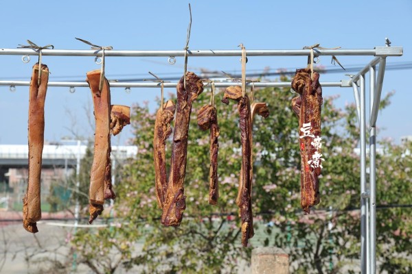 7、因为晚上比较冷风也比较大,经过一夜的风干之后表面的水基本没有。这样就不会吸引蚊子苍蝇之类的东西,如此会更卫生。经过长时间的挂晾风吹日晒大致十天吧也就完成了,届时可以切块打包冷冻放冰箱。