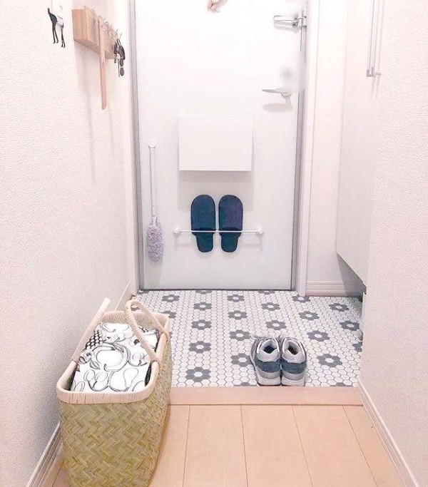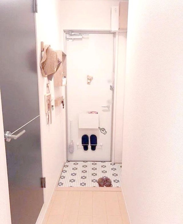 这个精致且收纳有序的卫生间, 利用墙面空间,收纳有序。通过使用各种收纳器具,所有的物品都整齐地悬挂在墙面上,不仅使得空间显得井然有序,还让取拿物品变得轻而易举。