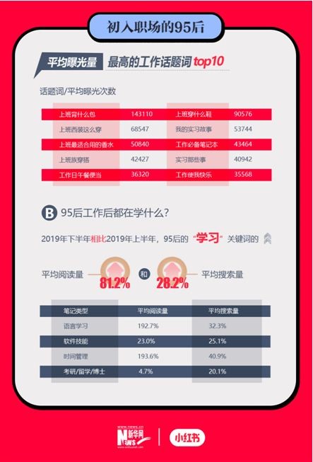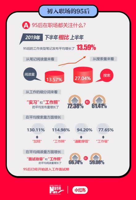 报告显示,随着95后逐渐进入职场期,小红书上95后的工作类型笔记的发布量、阅读量和搜索量均有不同程度的涨幅。“实习”和“工作照”相关笔记内容的平均发布量分别增长72.38%和61.41%。在平均搜索量方面,“加班”增长130.11%,“工作餐”增长77.38%。看来初入职场的95后,已经初步感受到加班体验。与此同时,“工作照”和“通勤穿搭”的增长比例也都超过100%,可见当下年轻白领们除了“爱加班”,同样也会注重自己的外在形象。