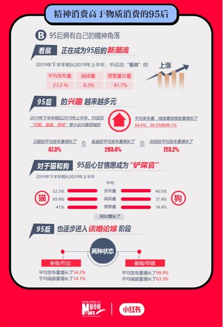 在精神消费层面,过去半年,小红书上“看展”的搜索量增长环比超过40%,平均发布量超过20%,“看展”也正在成为95后的新潮流之一。
