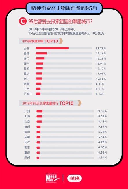 此外,报告还显示了95后对于城市的关注度,广州、上海、北京、杭州和深圳成为2019年搜索量TOP5。在平均搜索量涨幅上,台北、香港、澳门、郑州、昆明成为涨幅TOP5。