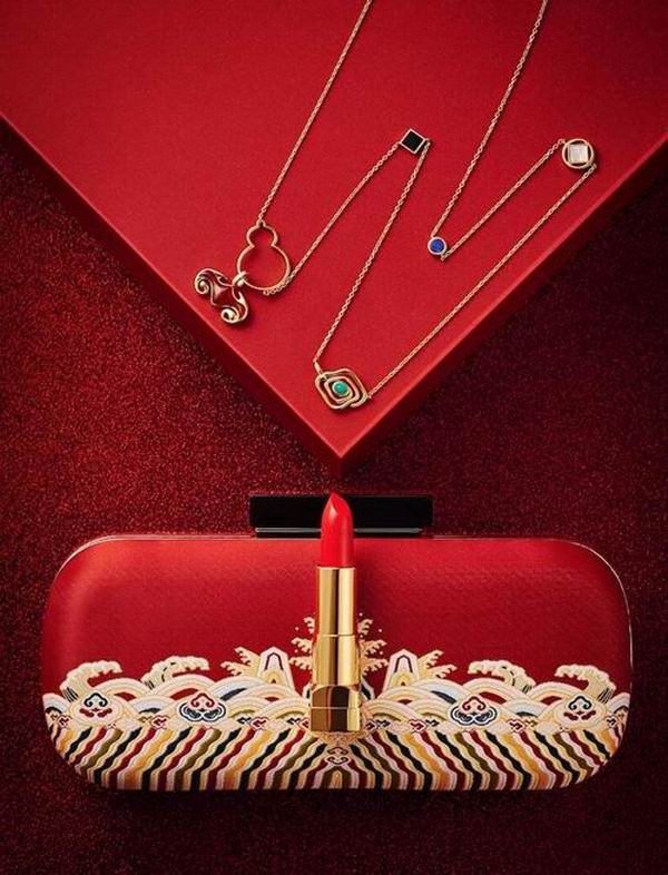 不仅如此,故宫还大胆尝试跨界合作,尝试着接受品牌邀约,合力推出跨界合作产品,将故宫元素融入到时尚、生活等各个不同的领域。去年年底,《时尚芭莎》就与故宫文化珠宝联手,推出了“故宫•芭莎红”玲珑福韵项链套装(Designed by 钟华),套装内的所有物品都能装在双面织有“海水江崖”纹样的手包之中。这只精美的“宋锦手包”平展挺阔,象征着福山寿海、万世升平,搭配的长肩带还能将其作为日常背包使用,而套装内的主要饰品——长达83cm长的项链选用弯曲、旋转等古典曲线,设计出蝙蝠、葫芦、祥云、钱币等象征福、禄、寿、财的吉祥图案,十分别致。