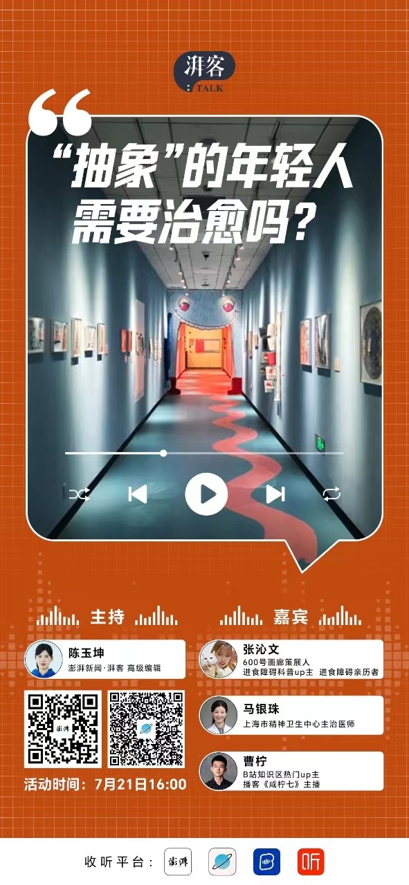 在7月21日,来自上海市精神卫生中心主治医师马银珠,将与几位嘉宾共同进行一次极具意义的对谈,对谈的主题是:“抽象”的年轻人,需要治愈吗?如果你也对这个问题好奇,那么请记得,到时候一定要来澎湃生活节!
