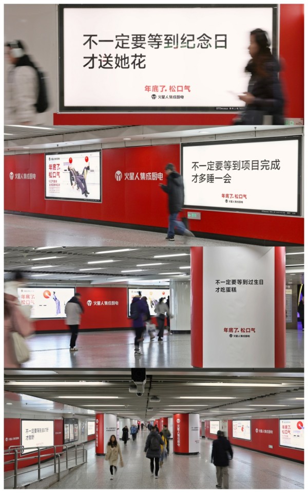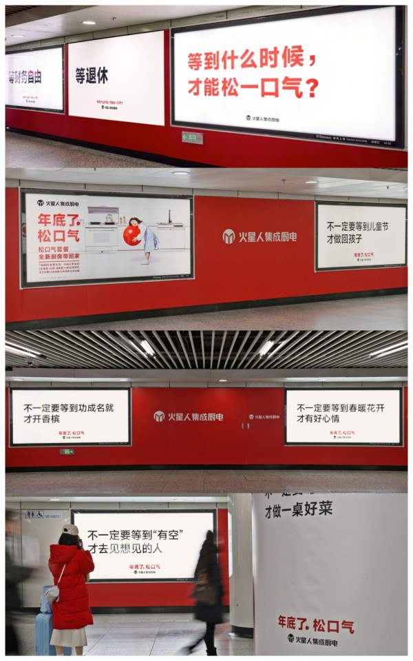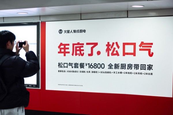 2026年1月8日,一组以“松口气”为主题的火星人集成厨电品牌广告上线。这组广告以极简的白底黑字设计,仅以一句话直击人心,在早晚高峰的通勤人流中迅速引发驻足与拍照。相关内容随后在抖音、微信等社交平台自发传播,短时间内形成广泛讨论。