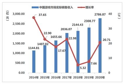 《2020年中国游戏产业报告》显示,2020年国内游戏市场实际销售收入为2786.87亿元,比上年增加478.1亿元,同比增长20.71%;其中自主研发游戏实际销售收入达2401.92亿元,比上年增加506.78亿元,同比增长26.74%,占国内市场销售总额八成以上;移动游戏收入2096.76亿元,比上年增加515.65亿元,同比增长32.61%。