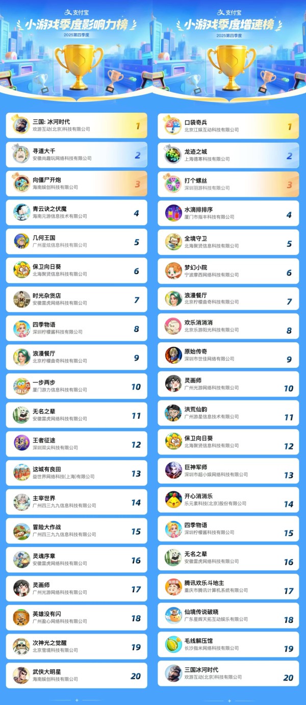 临近春节,又要到了支付宝一年一度的集五福活动,而这其实也是支付宝小游戏的特色流量红利期,去年就有多款游戏因此受益。回顾过去一年,小游戏市场整体依旧保持着30%以上的增速速度,而根据罗斯基的观察,2025年支付宝小游戏增长超过了100%。而最近支付宝小游戏发布了2025年Q4小游戏影响力和增速榜,也让我们看到更多优秀精品小游戏的出现。