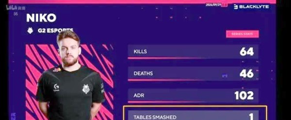 在9月份的CSGO BLAST秋季总决赛半决赛中,G2与VIT的激烈对决吸引了众多目光。图三的关键局,niko展现神勇,一举淘汰对面四人,但在最后的1V1对决中却遗憾失利。情绪激动的他,一拳砸穿了现场的专业电竞桌,以此发泄心中的懊恼。选手在比赛中因情绪发泄砸碎电竞桌,成为独特调侃方式。赛事方趁机调侃,在niko的结算画面上加上了“击杀桌子1张”的标签,并将那张砸碎的桌子送给他作为纪念。这个梗不仅带来了欢笑,更成为了一种独特的调侃方式,展现了电竞比赛中的意外与趣味。
