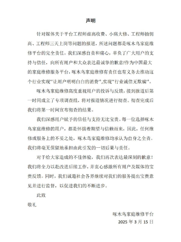 声明提到:针对媒体关于平台工程师虚高收费、小病大修、工程师抽佣高、工程师三天上岗等问题的报道,所述问题都是啄木鸟家庭维修平台的完全责任。我们深感自责和痛心,辜负了广大用户的支持与信任,向所有用户和大众表达最诚挚的歉意!
