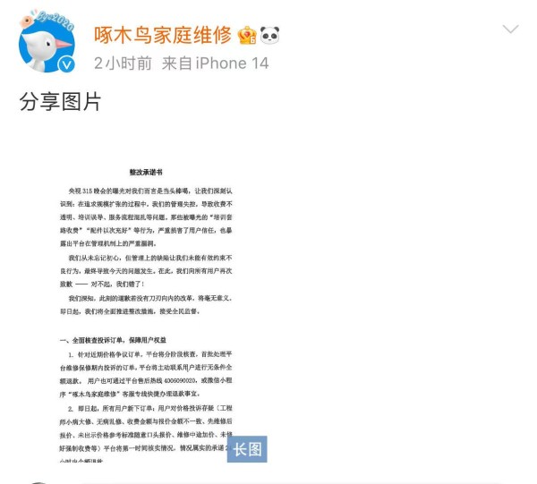 被推上风口浪尖后,啄木鸟推出了6项整改措施。根据公告,啄木鸟的整改覆盖被投诉订单的处理、价格透明化、用户知情权、维修工程师管理及收入结构等方面。其中,啄木鸟将保证所有维修订单必须在维修前提供标准报价单,用户确认后方可施工,杜绝“维修完成后才报价格”的行为。同时,所有维修订单享受30天内免费复检,确保维修质量达标。