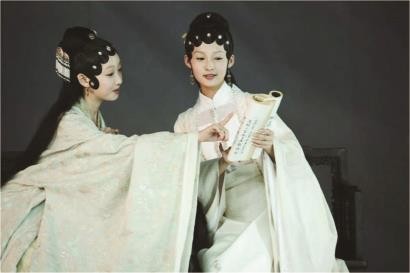 然而,在戏曲剧目的创排过程中,单一发型的优化并不能满足女性角色塑造的需要。1915年,梅兰芳在排演《嫦娥奔月》时就发现:“观众理想中的嫦娥,―定是个很美丽的仙女。过去也没有人排演过嫦娥的戏,我们这次把她搬上了舞台,对她的扮相,如果在奔入月宫以后还是用老戏里的,处理得不太合适的话,观众看了仿佛不够他们理想中的美丽,他们都会感觉到你扮的不像嫦娥的。那么这出戏就要大大地减色了”(梅兰芳:《舞台生活四十年》)。为了给嫦娥赋予飘飘欲仙的气质,他们开始从古代的仕女画中寻找灵感,最终设计出了一种新颖的假发头套,被后世称为“古装头”。这种发型的样子较为多样,大多是将长发拢于头顶,耸成“吕字”“品字”等对称形状的高髻,后面则梳马尾单辫或双辫。由于这种左右对称的正髻过于端庄、典雅,不方便衬托小姑娘活泼、机敏的特征,荀慧生进一步革新,又发明了歪在一边的发髻,被称作“留香髻”。这一类“古装头”的装扮相对便捷又具有变化性,所以后来逐渐成为了越剧、黄梅戏等年轻剧种的主要化妆手法。