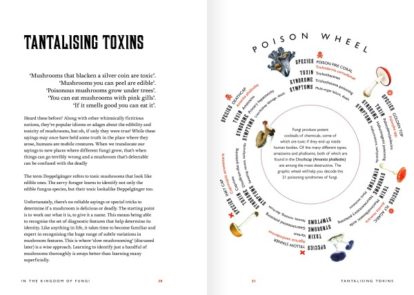 本书的一大亮点是封面上的可旋转真菌图鉴转盘。转动它,30种蘑菇的关键信息一目了然;翻开内页,还能进一步了解每种蘑菇的形态分类、分布地区、生长环境与基质偏好。从众所周知的毒蝇伞,到形态奇特的鬼笔、鸟巢菌……这本书就像一场环球蘑菇巡礼,带你认识地球上最引人入胜的真菌成员。