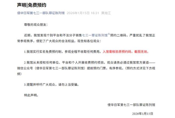 1月15日,陈列馆发布声明:“近期,我馆发现个别平台和不法分子销售七三一罪证陈列馆预约二维码,严重扰乱了我馆正常参观秩序,侵犯了广大观众的合法权益。”声明呼吁,观众务必通过官方渠道提前预约门票,有序参观。