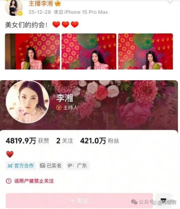 2026年1月16日上午,娱乐圈突发重磅消息:前湖南卫视“一姐”李湘的微博、抖音、小红书账号同步被标注“禁止关注”,新用户无法添加关注,仅能查看历史内容,相关话题迅速引爆热搜。