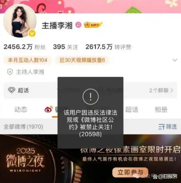 李湘多平台账号被禁止关注李湘账号被禁!多平台社交媒体账号无法关注