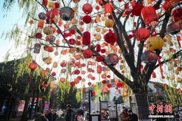 1月3日,江苏南京,城南老街的树上挂满灯笼营造节日氛围,吸引民众前来游玩。中新网记者 泱波 摄
