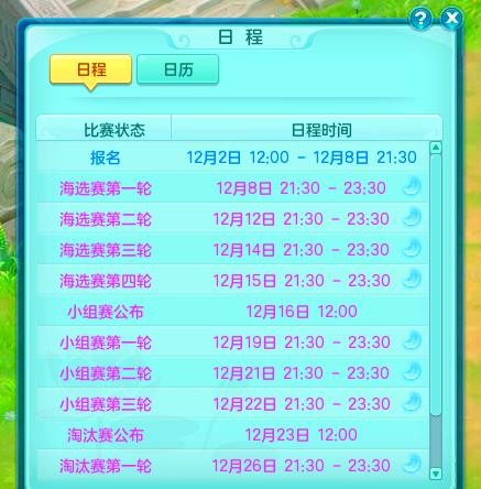 海选赛日程已定,12月8日、12日、14日及15日的21:30至23:30,是您展现实力的舞台。记得在21:30至22:00准时进场,与各路高手一决高下。