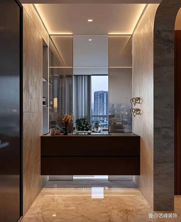 3.金属点缀:香槟金、拉丝古铜、黑钛等哑光或轻度光泽的金属,是轻奢风格中画龙点睛之笔。它们可以出现在家具的纤细腿脚、灯具的框架、镜子的边框或小小的开关面板上。切记“少即是多”,恰到好处的金属光泽能增添精致度,过度使用则易流于俗气。
