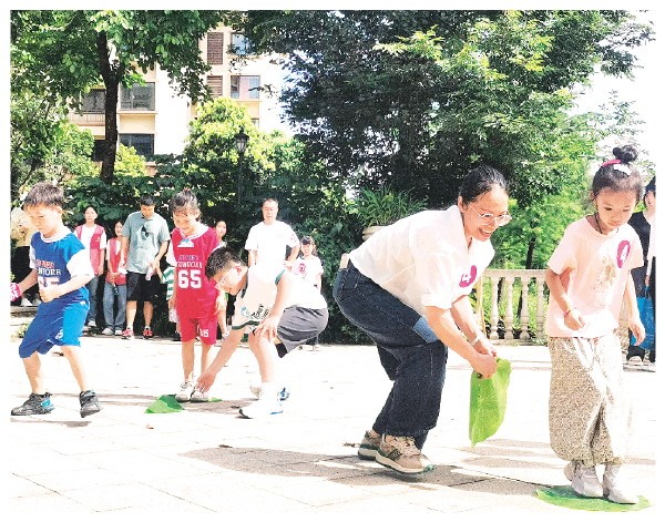 活动开始,健身操音乐响起,孩子们像欢快的小鹿蹦蹦跳跳,家长们也跟着舒展筋骨。8岁的朵朵指着爸爸运动时晃动的肚子,童言无忌地喊道:“爸爸的肚子在跳舞!”逗得周围人哈哈大笑。沿溪设置的闯关区更是热闹非凡——有的家长手舞足蹈地比画着各种动作让孩子猜词语,有的家庭齐心协力完成“健康蛙跳赛”,还有的小朋友小心翼翼地用球拍运送象征营养的乒乓球,生怕“健康”掉在地上。