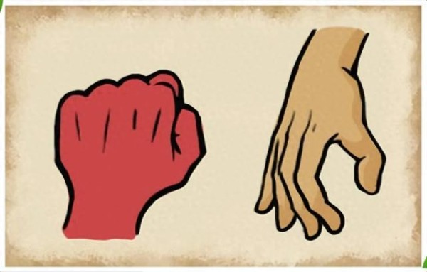 左边一只红色的手握成一个拳头,右边一只正常的手没有握成拳头。