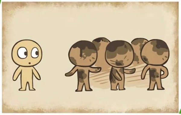 右边一群人身上都弄脏了,左边一个干净的人瞪大眼睛在看着他们。