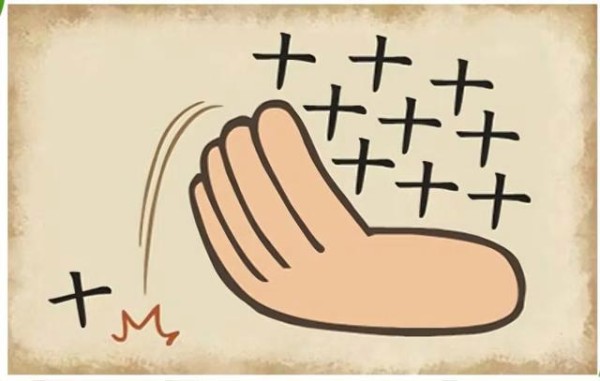 一只手捧着9个“十”字,还有一个“十”字拿不了,掉出来了。