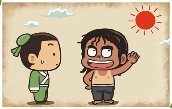 一个头发很长,晒得很黑的野人在跟一个古装小男孩聊天,他还伸手指着太阳。